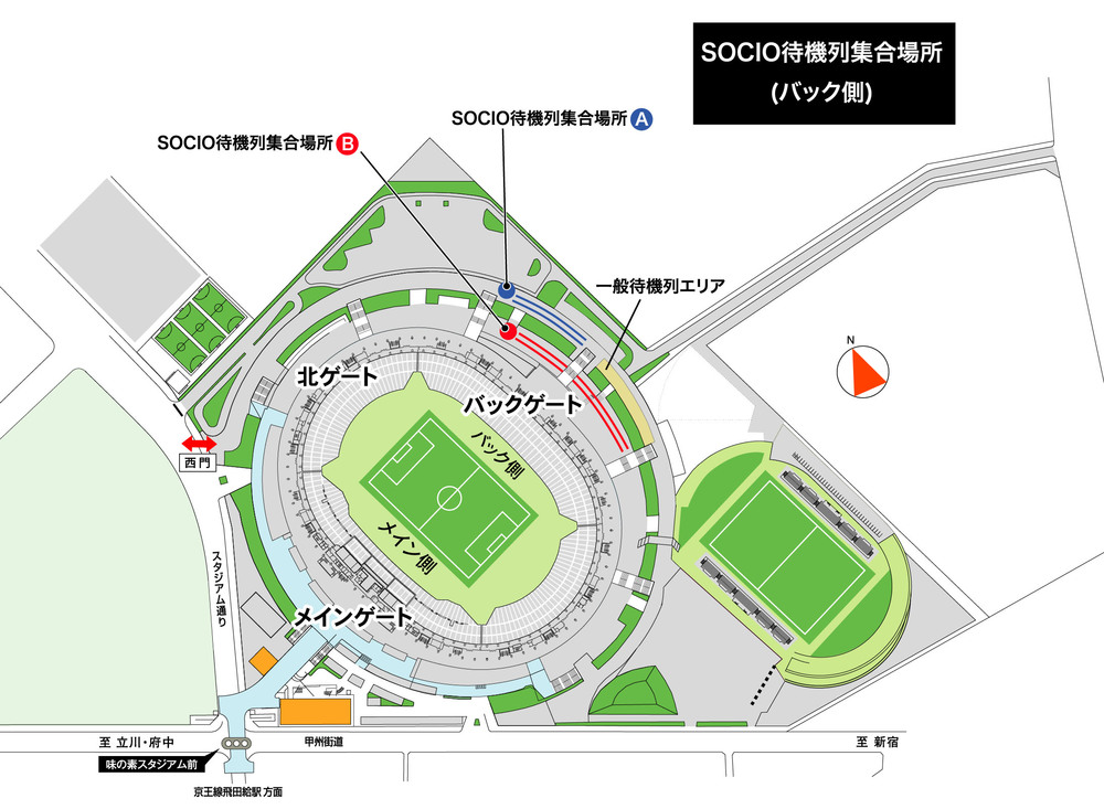 ・列整理の集合場所は下記の通りとなります。「西門」から場内にお入りください。また整理番号で集合場所(A)(B)が違いますのでお気を付けください。