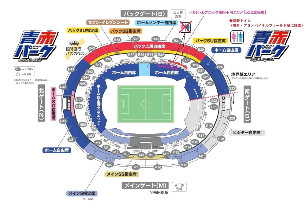 工事のスケジュール変更により、座席の使用不可エリアが以下の通りとなります。11/23(土)湘南戦と同じエリアが使用できませんので、ご注意ください。