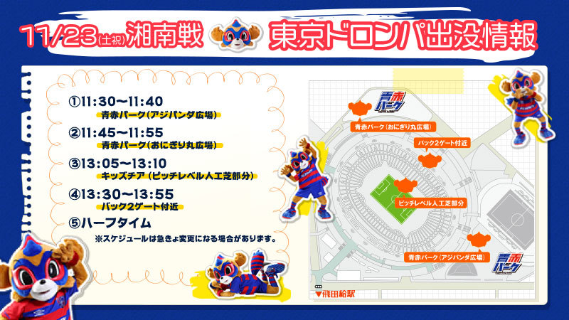 11/23(土祝)2019明治安田生命J1リーグ第32節 vs湘南ベルマーレ(14:00キックオフ/味の素スタジアム)に東京ドロンパが下記の通りあらわれます。ぜひ、「東京ドロンパ」に会いにきてください!!お楽しみに!