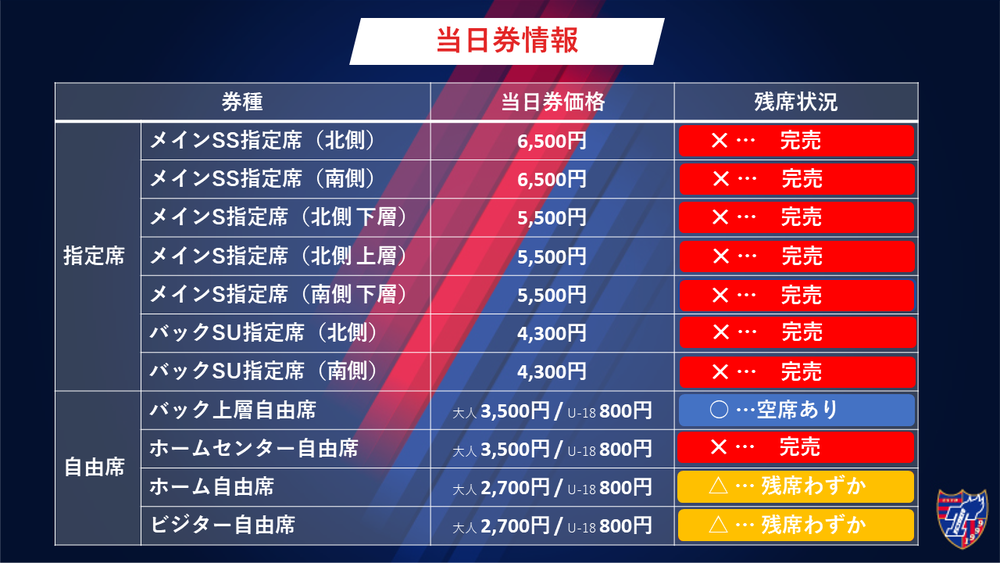 ・FC東京応援エリア(各指定席ホーム側、バック上層自由席ホーム側、ホームセンター自由席、ホーム自由席)内でビジターチームの応援および応援グッズの着用はできません。