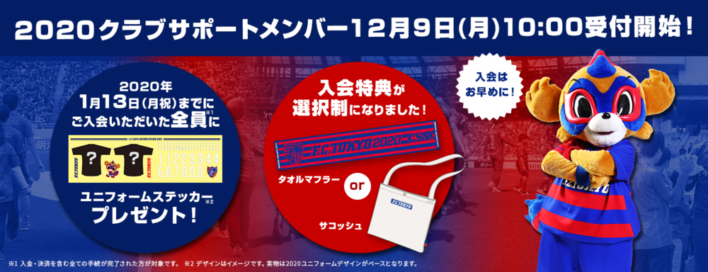 「2020年間チケット」および「2020クラブサポートメンバー」の会員募集について、12月9日(月)10:00より開始いたしますので、お知らせいたします。