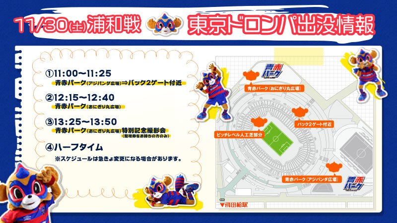 11/30(土)2019明治安田生命J1リーグ第33節 vs浦和レッズ(14:00キックオフ/味の素スタジアム)に東京ドロンパが下記の通りあらわれます。ぜひ、「東京ドロンパ」に会いにきてください!!お楽しみに!