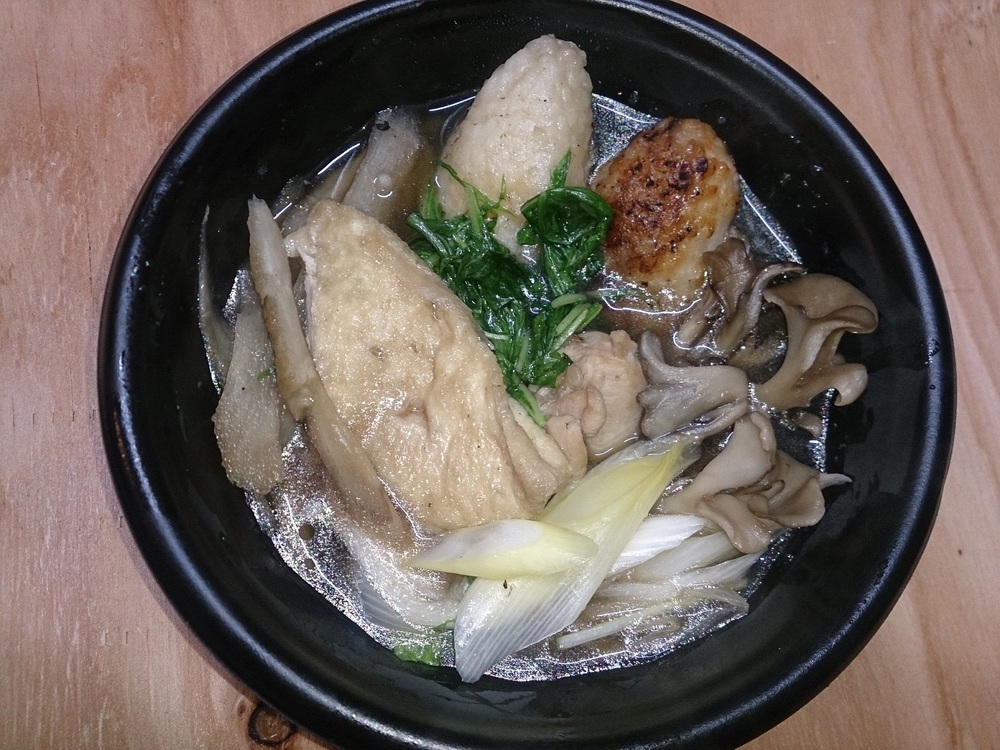 「一本一本手づくりして香ばしく焼きあげたキリタンポと鶏肉・ごぼう・油揚げ・舞茸・ネギなどを醤油スープで煮込みました。あったまります!」