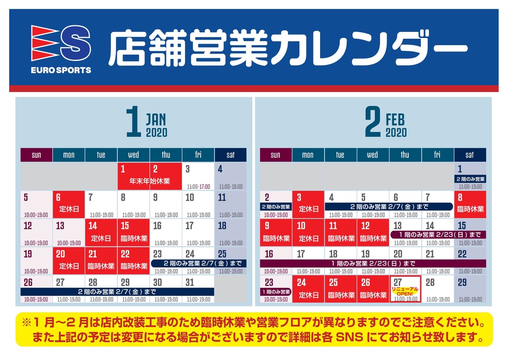 ユーロスポーツ味の素スタジアム店『店内改装工事に伴う営業日』のお知らせ