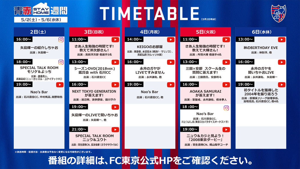 5月2日(土)~5月6日(水休)の期間『青赤STAY HOME週間』として、ファン・サポーターのみなさまがおうちで楽しめるよう、映像のLIVE配信やプレゼントキャンペーンなど様々な企画を実施いたします!