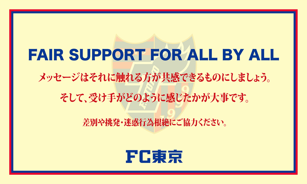 Jリーグ統一禁止事項にある「人種、肌の色、性別、言語、宗教、政治または出自等に関する差別的あるいは侮辱的な発言または行為をすること。」を踏まえ、FC東京としましては、2014年9月に『FAIR SUPPORT FOR ALL BY ALL』のメッセージを発信し差別や挑発・迷惑行為の根絶に取り組んでおります。