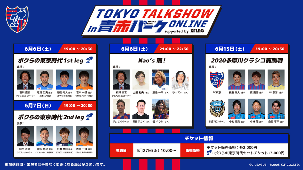 5月上旬以降、ライブ配信を行ってまいりましたが、さらにファン・サポーターの皆様とのコミュニケーションを深め、選手・スタッフ、ゲストの普段知ることができない一面を垣間見ていただくため、チケット購入者限定の 【TOKYO トークショー in青赤パークオンライン supported by XFLAG】を開催いたします。
