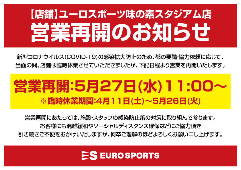 ユーロスポーツ味の素スタジアム店『営業再開』のお知らせ