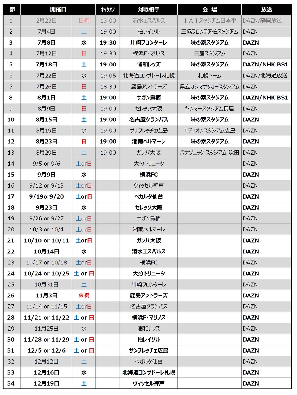 ※第14節以降の日程詳細は、8月初旬・10月初旬に分割しての発表を予定しています。