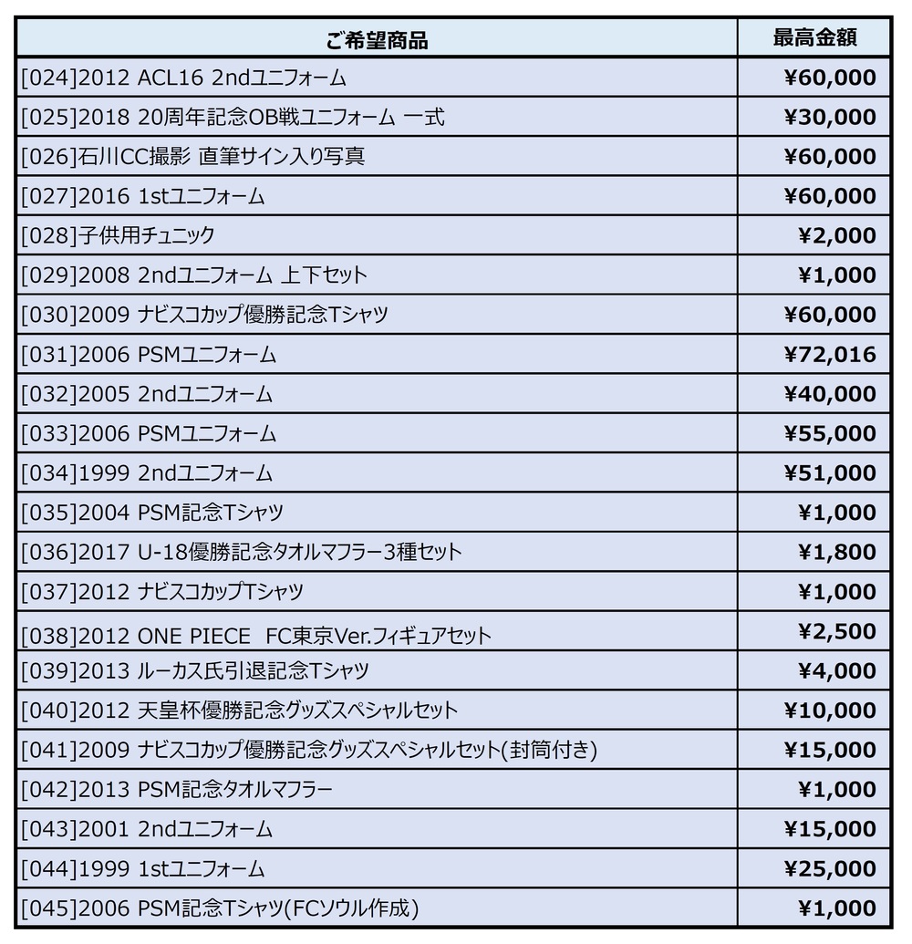 ・同じJリーグIDで同一商品へ複数回ご入札をされた場合、一番高い入札金額を採用いたします。