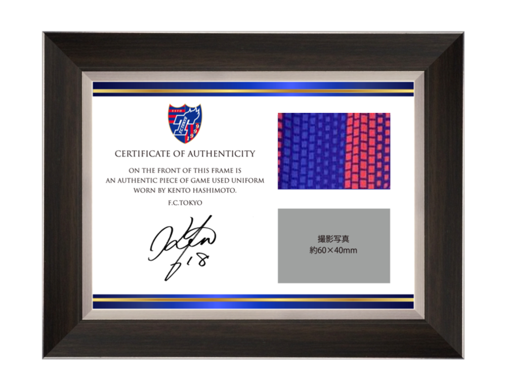 (1)ユニフォーム証明書は、オーセンティックユニフォームのサインが本人直筆であることを証明するとともに、2020明治安田生命J1リーグ第1節vs清水エスパルス戦、第3節vs川崎フロンターレ戦で橋本選手が試合で着用したユニフォームの一部分をカットし、生地を証明書に挟み込んでいます。