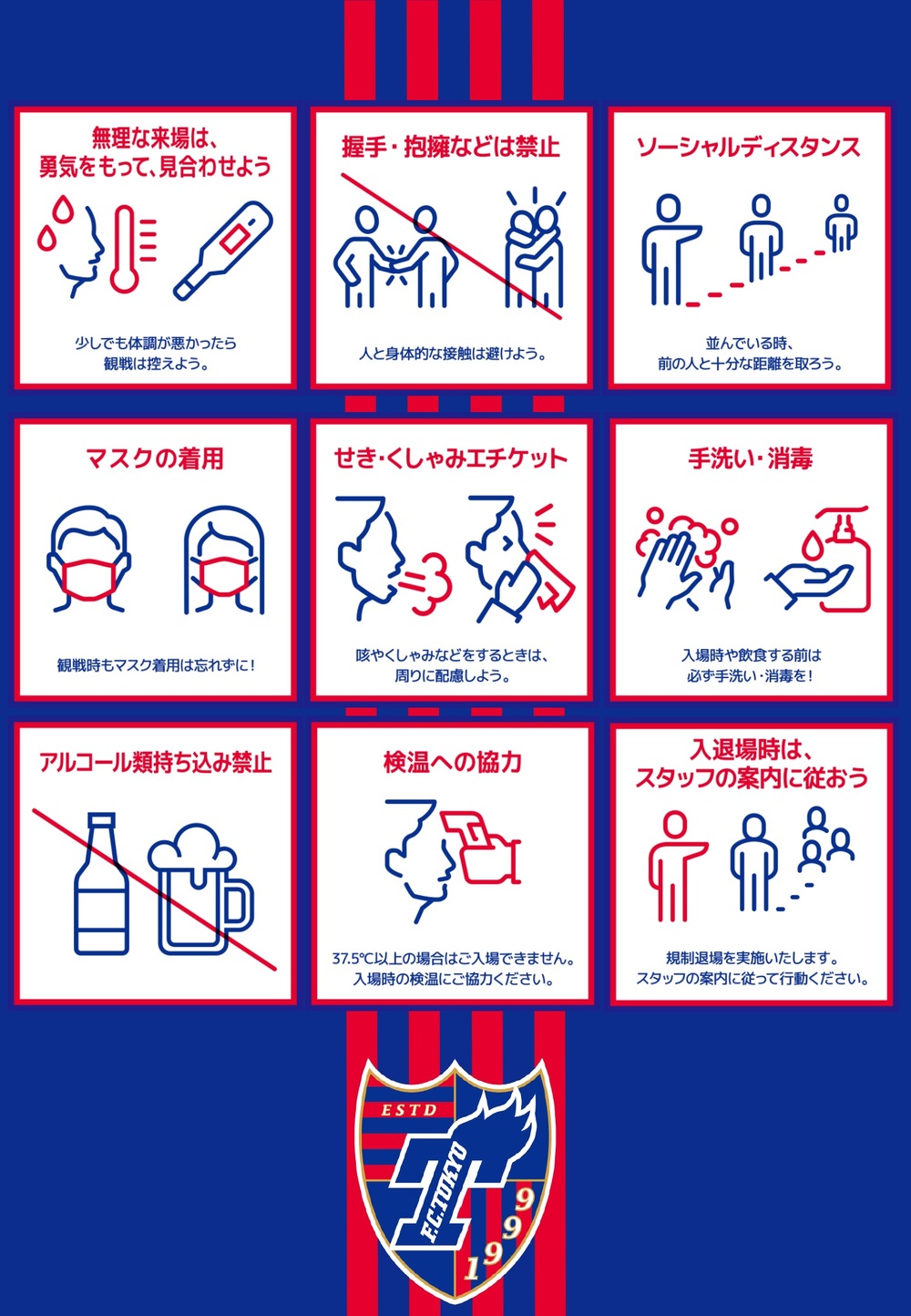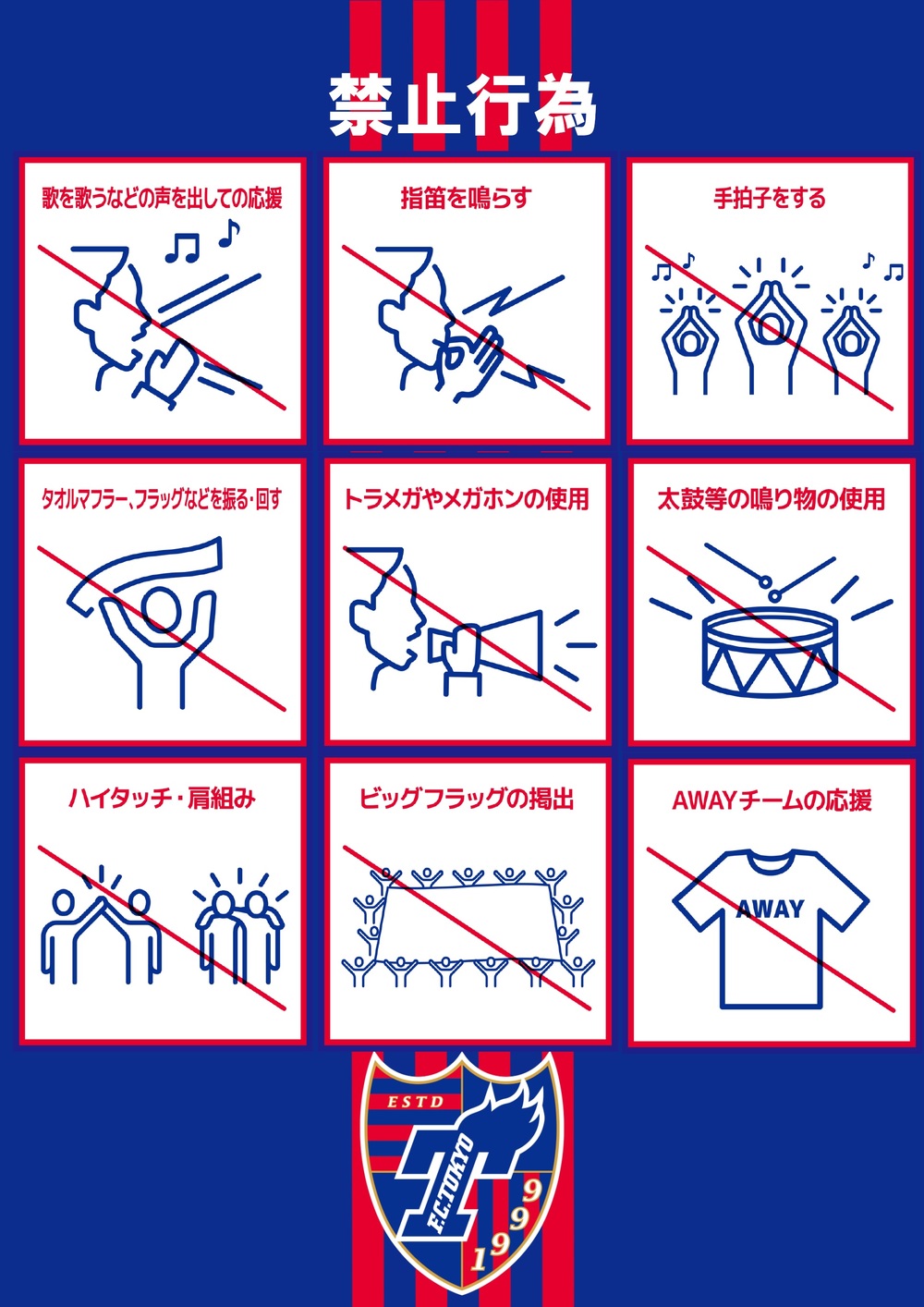 Jリーグ統一禁止ルール(Jリーグ共通観戦マナー&ルール)およびFC東京サッカー試合運営管理規定、ならびに「Jリーグ 新型コロナウイルス感染症対応ガイドライン」を遵守くださいますようお願いいたします。