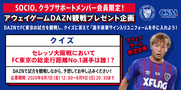 SOCIO、クラブサポートメンバーのみなさまにFC東京のアウェイゲームを楽しんで視聴いただけるよう、アウェイゲーム特別企画として『アウェイゲームDAZN観戦プレゼント企画』を実施させていただきます。
