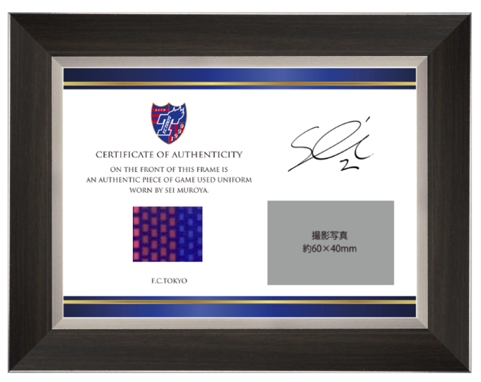 (1)ユニフォーム証明書は、オーセンティックユニフォームのサインが本人直筆であることを証明するとともに、2020明治安田生命J1リーグにて室屋選手が実際に試合で着用したユニフォームの一部分をカットし、生地を証明書に挟み込んでいます。