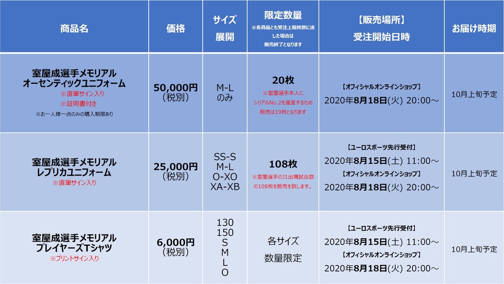 ※「室屋成選手メモリアルレプリカユニフォーム」および「室屋成選手メモリアルプレイヤーズTシャツ」は、8/15(土)ユーロスポーツ味の素スタジアム店での先行受注開始、8/18(火)20:00~オフィシャルオンラインショップで受注開始いたします。ただし先行受注で受注上限数に達した場合はオフィシャルオンラインショップでの販売はございません。