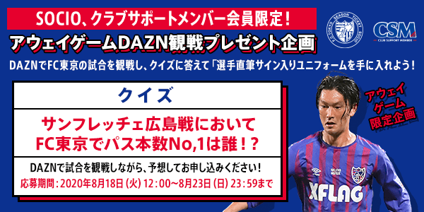 SOCIO、クラブサポートメンバーのみなさまにFC東京のアウェイゲームを楽しんで視聴いただけるよう、アウェイゲーム特別企画として、「選手直筆サイン入りユニフォームを手に入れよう!」企画の第2弾を実施いたします。
