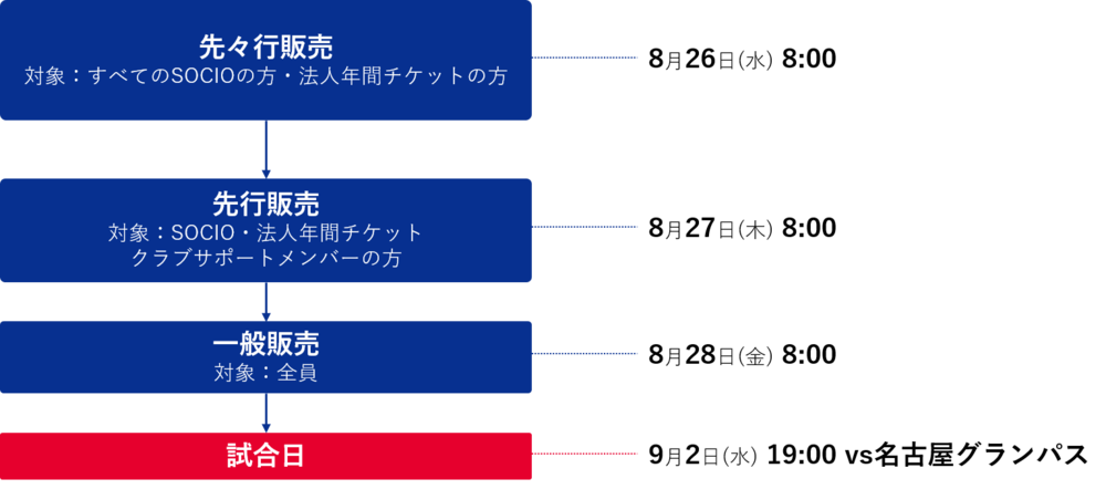 ・チケット販売は試合日の約1週間前から開始とさせていただきます。また、SOCIO先々行・会員先行・一般それぞれの販売初日はAM8:00より販売開始となります。