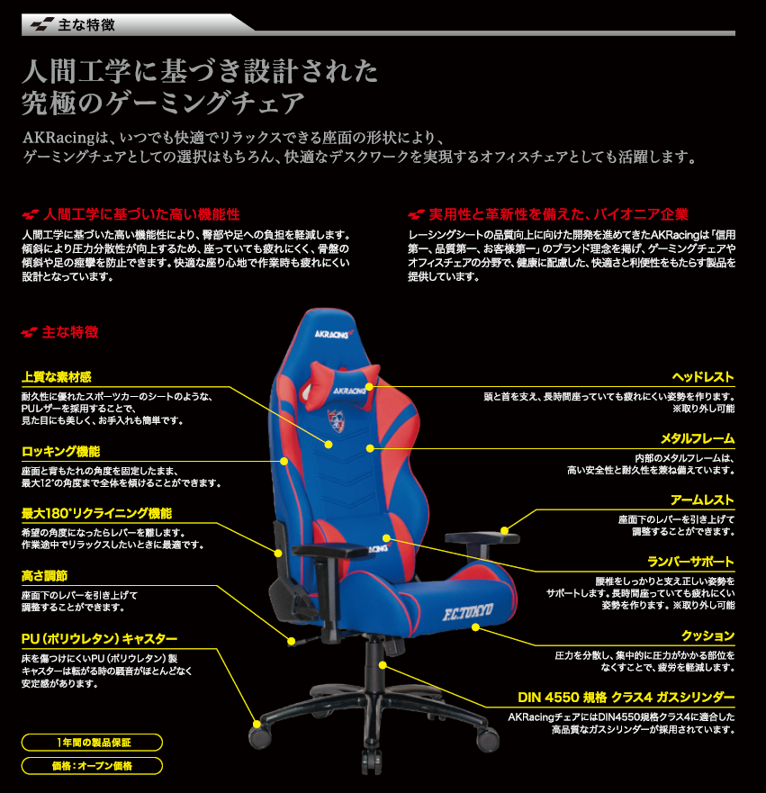 今回コラボするシートは、AKRacingゲーミングチェアのスタンダードモデルとして定評あるOvertureシリーズをベースとした商品で、スタジアムシートと同デザインとなります。シートの張地はFC東京のチームカラーであるブルー/レッドを基調とし、バックレスト中央にクラブチームのエンブレムを配置したデザインです。