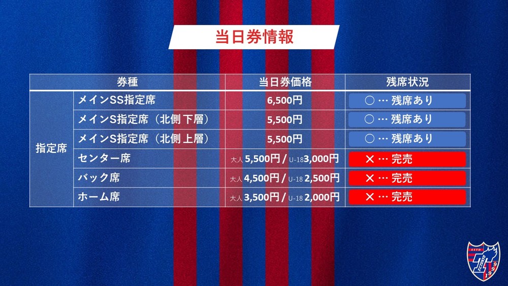 なお、会場での当日券販売はいたしません。チケットFC東京(Jリーグチケット)のみでの販売となります。