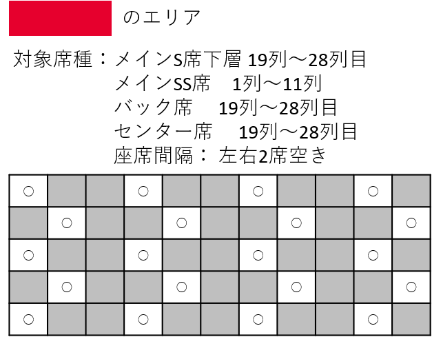 超厳戒態勢時(強い制限)の試合開催(5,000人制限)は、メイン側(メインSS、メインS)とバック側(バック、センター)が横2席間隔、北サイド(ホーム)は下層17列目まで横2席間隔、下層18列目以降は横3席間隔、上層はすべて横3席間隔となります。