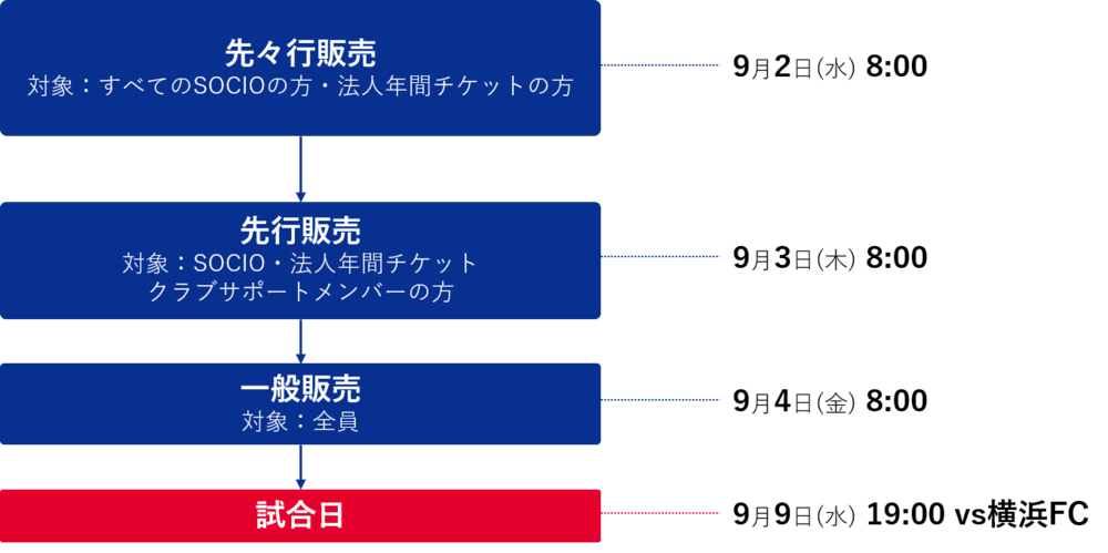 ・チケット販売は試合日の約1週間前から開始とさせていただきます。また、SOCIO先々行・会員先行・一般それぞれの販売初日はAM8:00より販売開始となります。