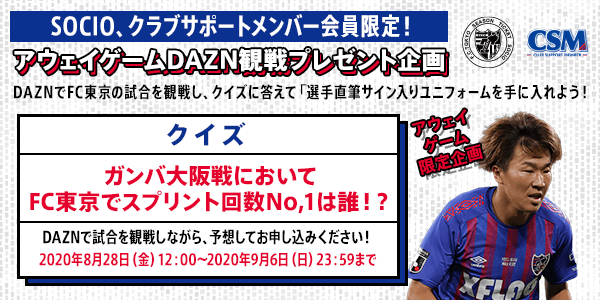 SOCIO、クラブサポートメンバーのみなさまにFC東京のアウェイゲームを楽しんで視聴いただけるよう、アウェイゲーム特別企画として、「選手直筆サイン入りユニフォームを手に入れよう!」企画の第2弾を実施いたします。