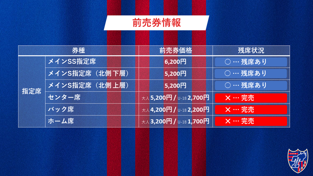 9/9(水) 横浜FC戦 前売券販売について