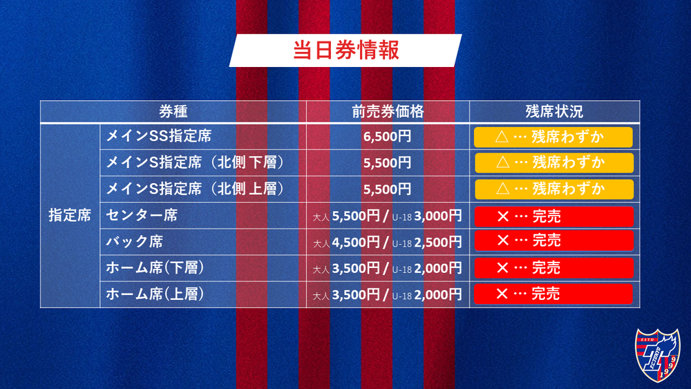 なお、会場での当日券販売はいたしません。チケットFC東京(Jリーグチケット)のみでの販売となります。