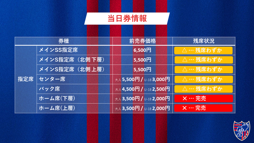 なお、会場での当日券販売はいたしません。チケットFC東京(Jリーグチケット)のみでの販売となります。