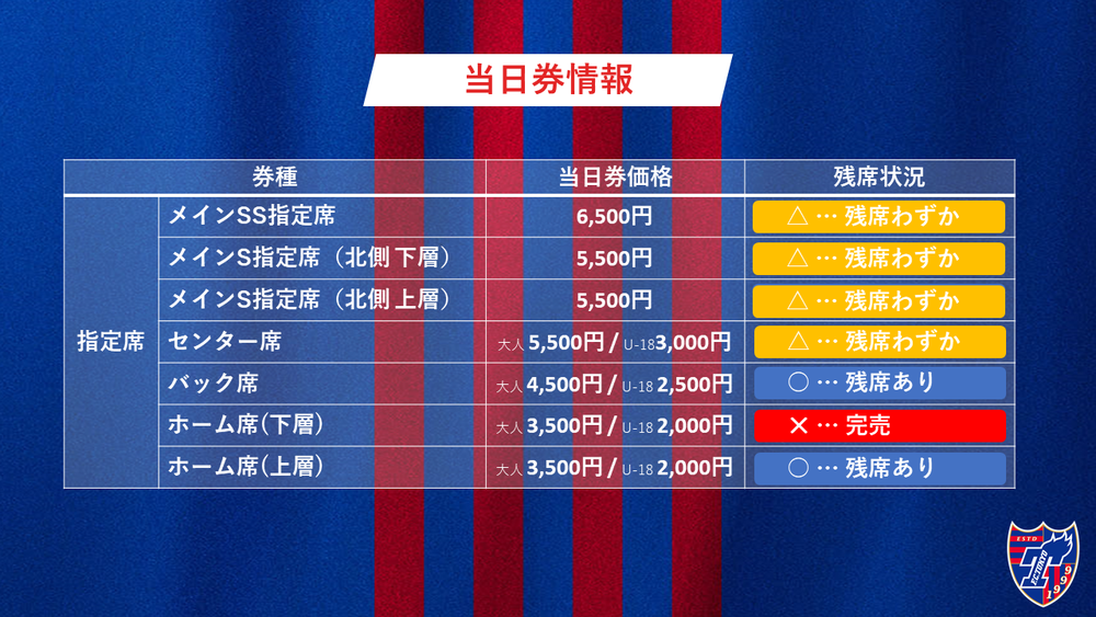 なお、会場での当日券販売はいたしません。チケットFC東京(Jリーグチケット)のみでの販売となります。