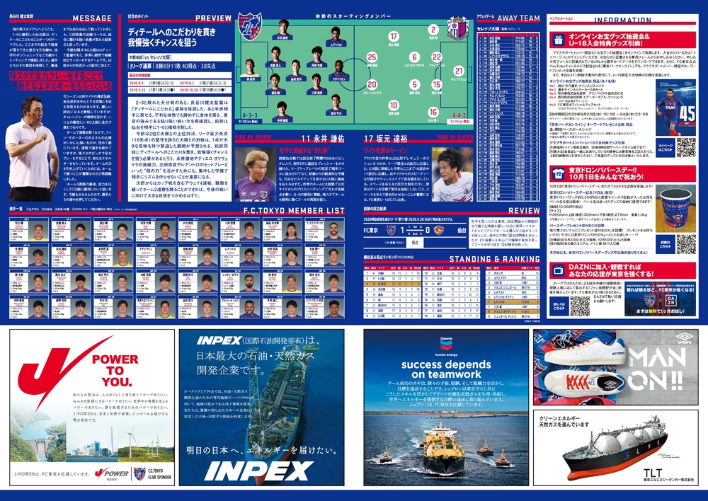 9/23(水) 2020明治安田生命J1リーグ 第18節 vs セレッソ大阪(19:00キックオフ/味の素スタジアム)のオフィシャルマッチデープログラムについて、下記のとおりご案内いたします。