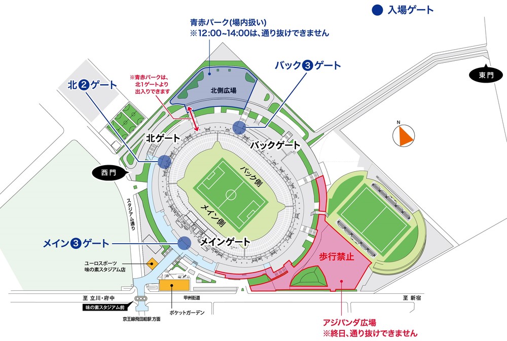 ・バナー(旗、横断幕)の事前準備をされる方には、開門120分前にスタジアム敷地内の「ユーロスポーツ味の素スタジアム店横三角広場」にお集まりください。