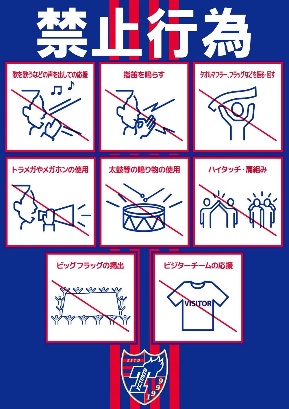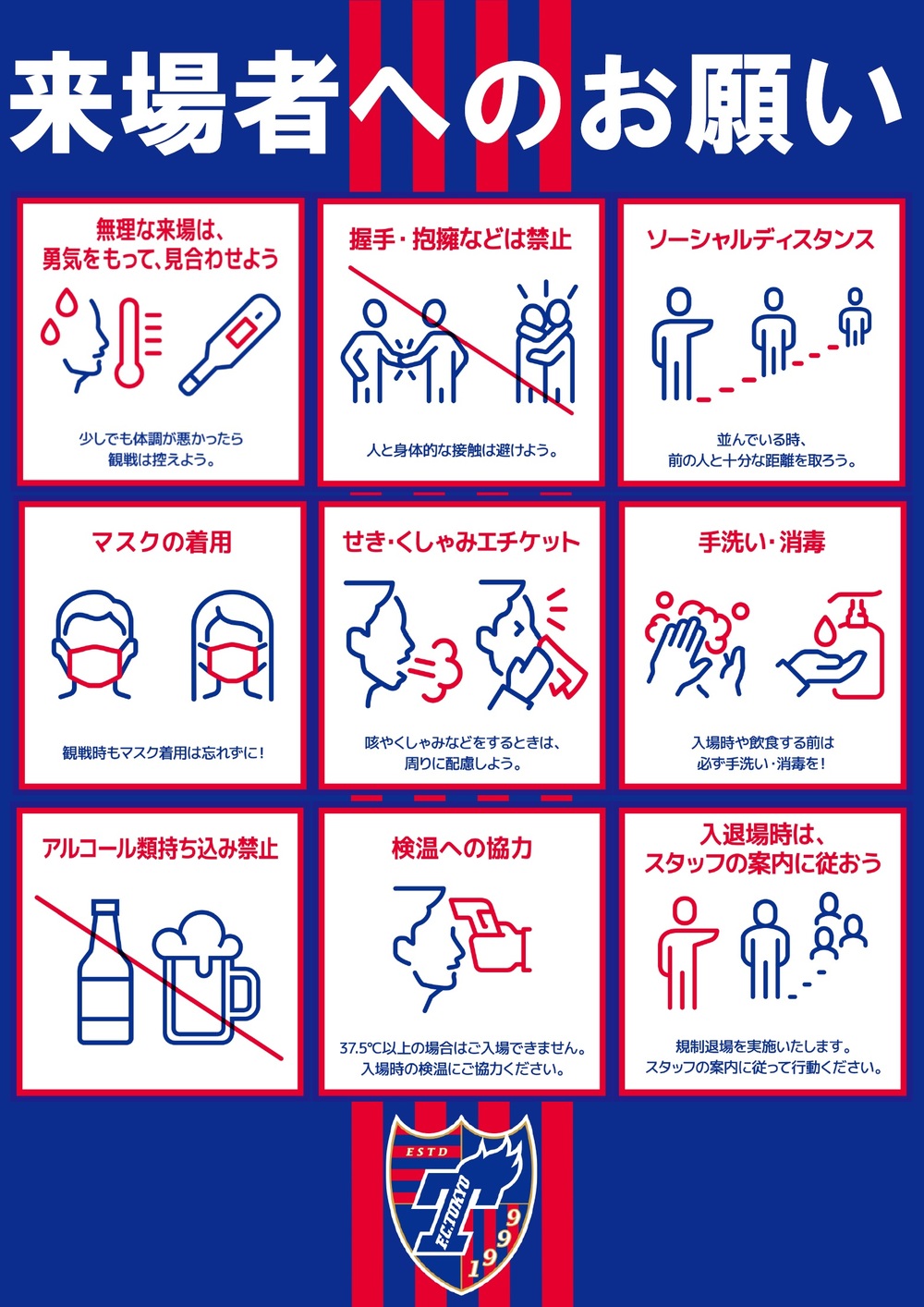 Jリーグ統一禁止ルール(Jリーグ共通観戦マナー&ルール)およびFC東京サッカー試合運営管理規定、ならびに「Jリーグ 新型コロナウイルス感染症対応ガイドライン」を遵守くださいますようお願いいたします。