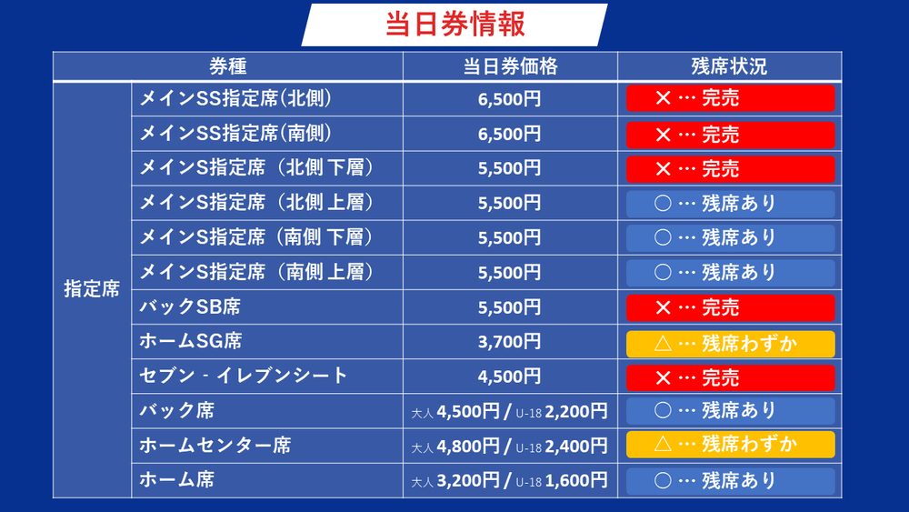 ※開門前の待機列はありません。全席指定席となっております。開門前にスタジアムへご来場いただくことはご遠慮ください。