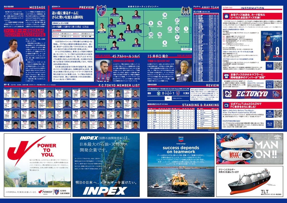 10/10(土) 2020明治安田生命J1リーグ 第21節 vs ガンバ大阪(14:00キックオフ/味の素スタジアム)のオフィシャルマッチデープログラムについて、下記のとおりご案内いたします。