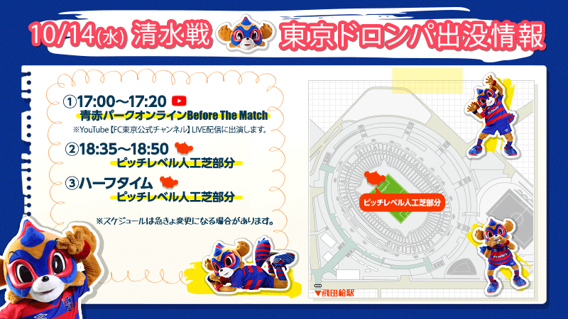 10/14(水) 2020明治安田生命J1リーグ第22節 vs清水エスパルス(19:00キックオフ/味の素スタジアム)に東京ドロンパが下記の通りあらわれます。お楽しみに!