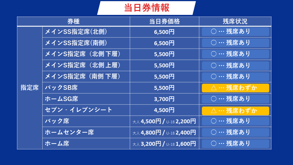 ※チケットの販売は試合当日の19:30~となりますが、入場はハーフタイムからとなります。