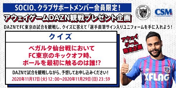 SOCIO、クラブサポートメンバーのみなさまにFC東京のアウェイゲームを楽しんで視聴いただけるよう、アウェイゲーム特別企画として実施している「選手直筆サイン入りユニフォームを手に入れよう!」企画も今回の仙台戦がラストとなります!