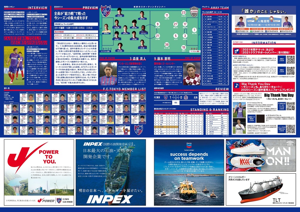 12/19(土) 2020明治安田生命J1リーグ 第34節 vs ヴィッセル神戸(14:00キックオフ/味の素スタジアム)のオフィシャルマッチデープログラムについて、下記のとおりご案内いたします。