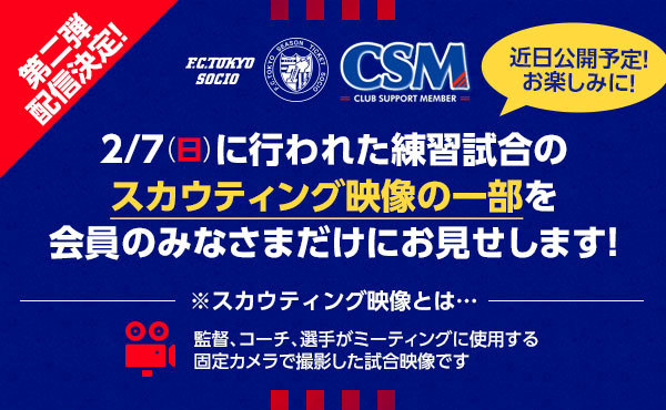 2/3(水)の練習試合映像 限定公開に続き、2/7(日) に実施しました練習試合 京都サンガF.C.戦のスカウティング映像の一部を、SOCIO・クラブサポートメンバーのみなさまに期間限定で近日中に配信予定です。