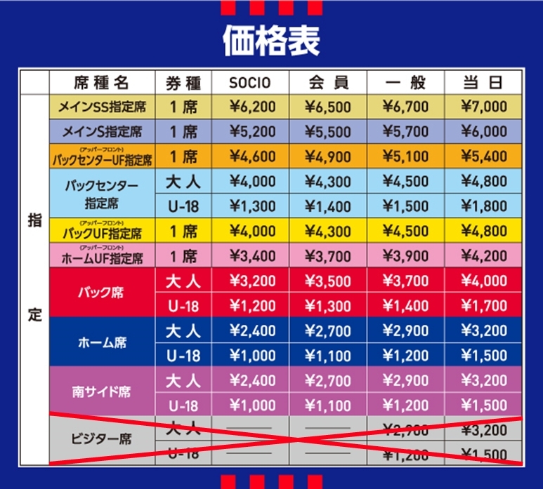※現在発出されている緊急事態宣言の実施期間(3/7)以降に開催される試合のため、5,000人制限時の価格から変更しております。※ビジター席については、制限緩和が確定した以降に販売を予定しています。「ビジター席」のチケットは販売いたしません。