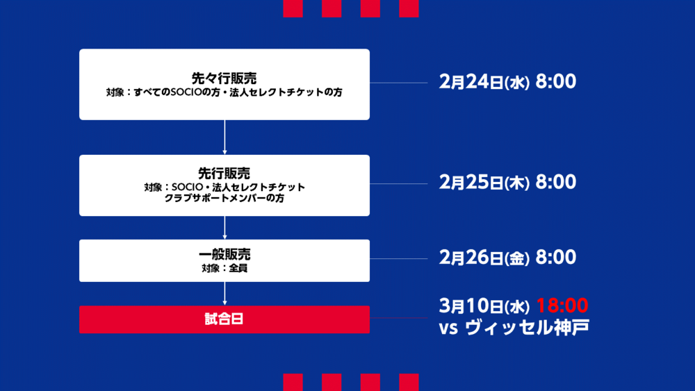 制限付き試合につき、SOCIOカードでのご入場は出来ません。別途、チケットをお買い求めください。2021SOCIOの方を対象として、先々行販売を実施いたします。