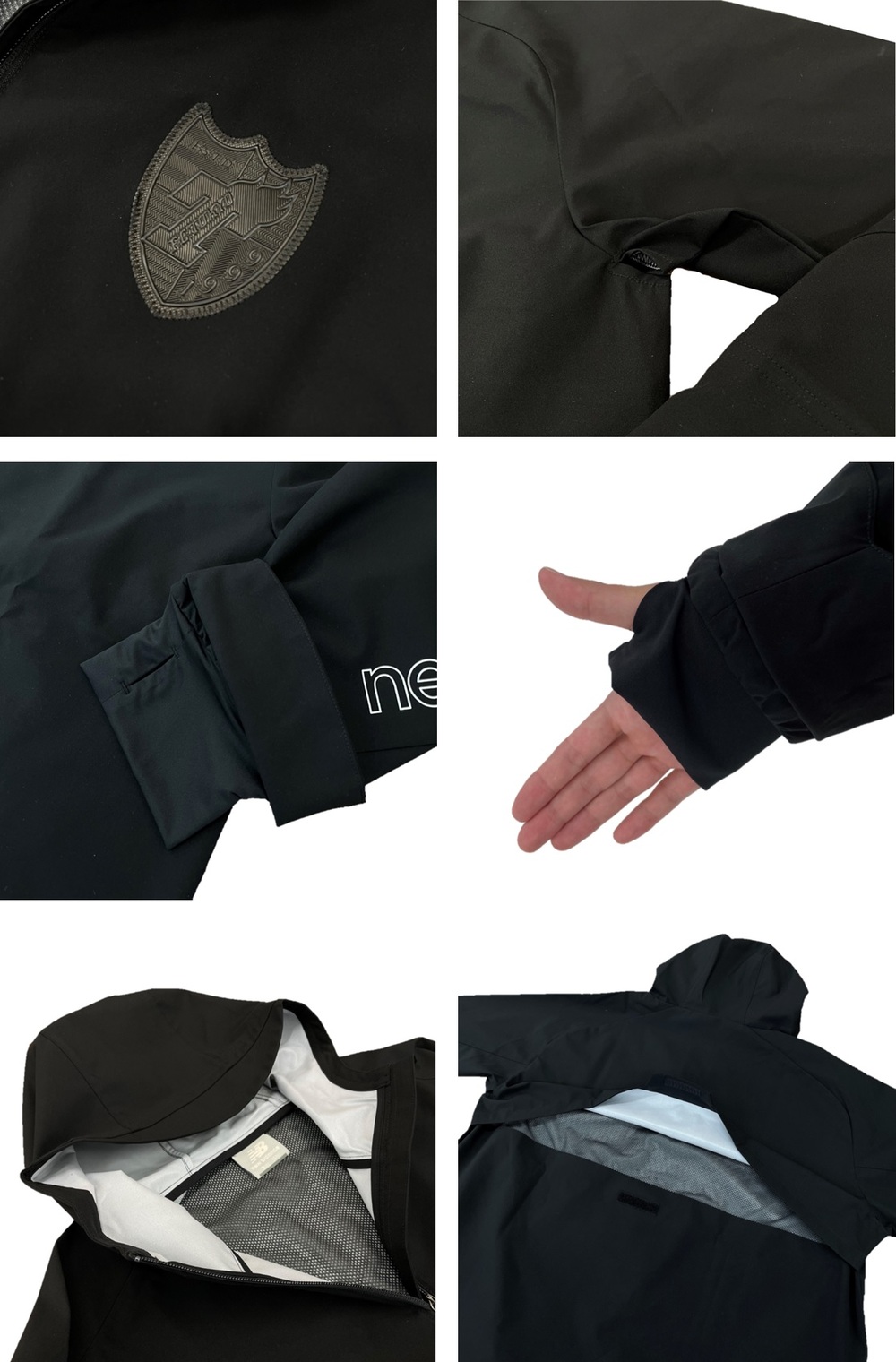 耐久撥水加工とストレッチ性を兼ね備えた機能的なアイテム。マットなブラックエンブレムでシンプルにまとまったデザインは普段使いにも最適。