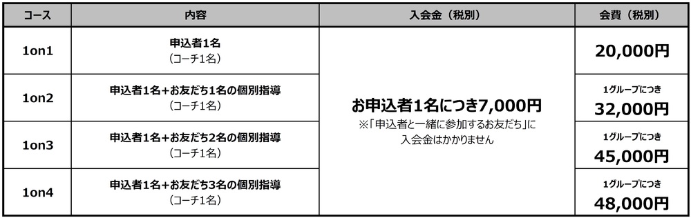 ※1回60分のトレーニングで、1対1からお友だちとご一緒に最大4名まで指導を承ります。