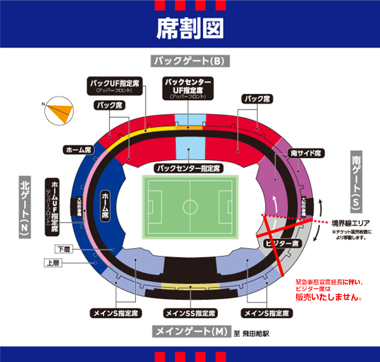 また、「ビジター席」のチケットは販売しないため、ビジターチームを応援する方はご来場いただけません。