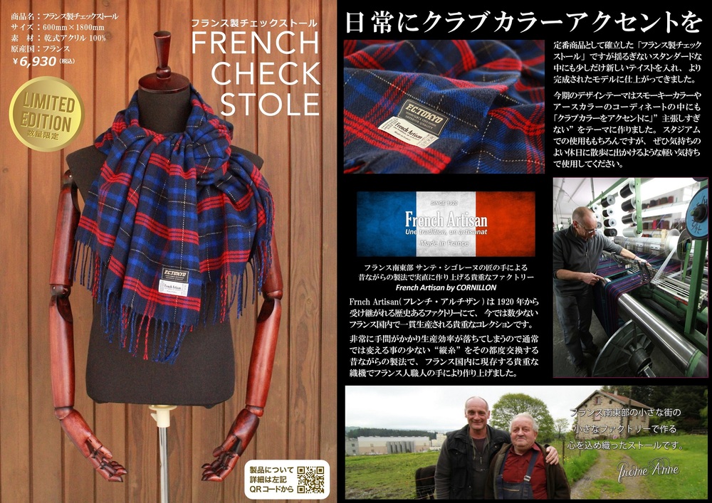 定番商品として確立した本場フランス製のチェックストール!今回は、「クラブカラーをアクセントに」「主張しすぎない」をテーマに作りました。