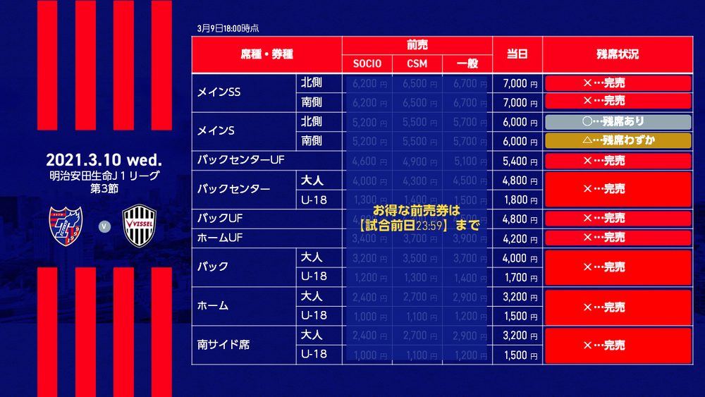 2021明治安田生命J1リーグ 第3節 FC東京 vs ヴィッセル神戸(19:00→18:00キックオフ/味の素スタジアム)の当日券販売につきまして、下記のとおりお知らせいたします。
