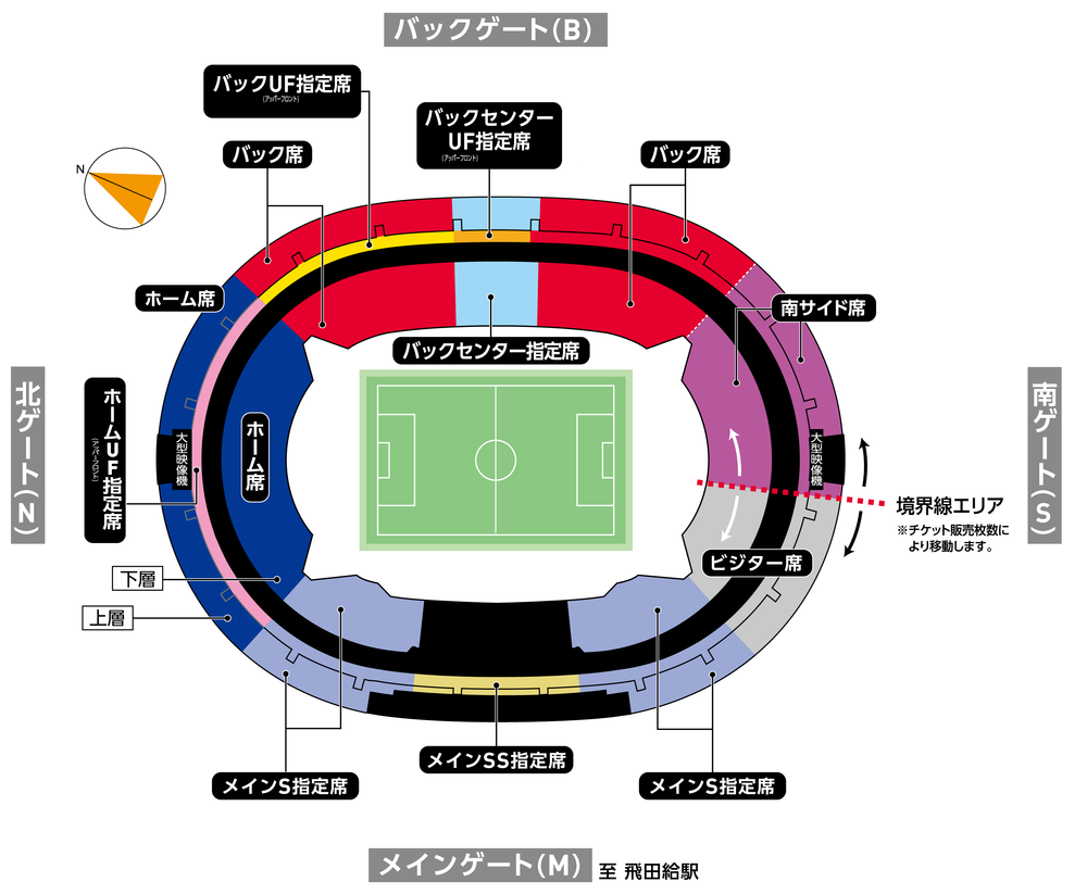 ビジターグッズを着用してビジターチームの応援ができる席種は「ビジター席」のみとなり、それ以外の席種は全てFC東京の応援席となります。