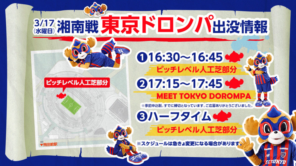 3月17日(水) 2021明治安田生命J1リーグ 第5節 vs 湘南ベルマーレ(18:00キックオフ/味の素スタジアム)に東京ドロンパが下記の通りあらわれます。