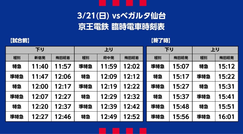 3月21日(日) 2021明治安田生命J1リーグ 第6節 vs ベガルタ仙台(13:00キックオフ/味の素スタジアム)にて運行される臨時交通アクセス(鉄道)についてご案内いたします。
